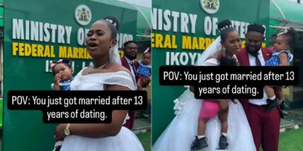 The ceremony took place at the Lagos State marriage registry, where the bride was seen in a white gown, holding her baby, radiating joy.