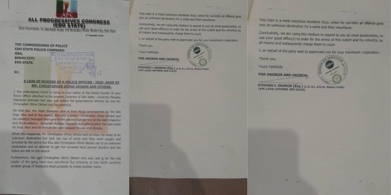 The Edo State chapter of the All Progressives Congress (APC) has petitioned the Commissioner of Police, Edo State Command, calling for the immediate arrest and prosecution of activist Christopher Okhai Okhani over the alleged murder of a police officer, Inspector Akor, in 2024.