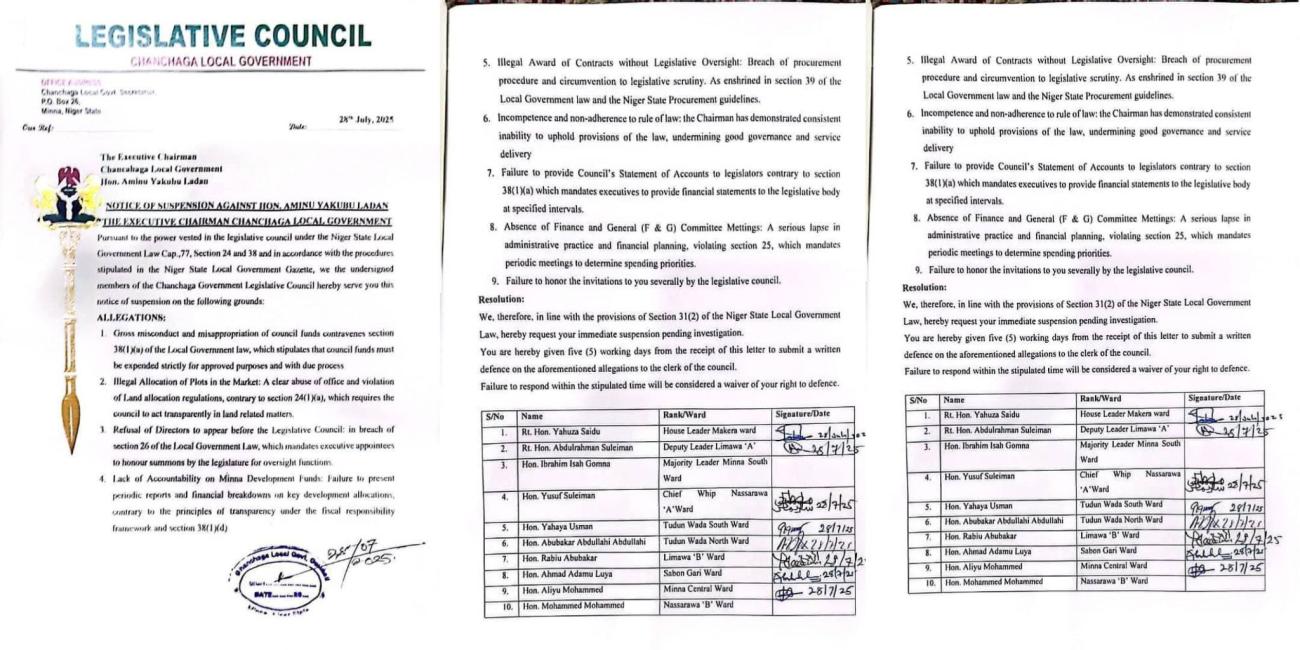 However, in a suspension notice dated July 28, 2025, eight out of ten councillors signed a resolution invoking provisions of the Niger State Local Government Law to temporarily remove Ladan from office, citing nine serious allegations ranging from financial misconduct to abuse of office.