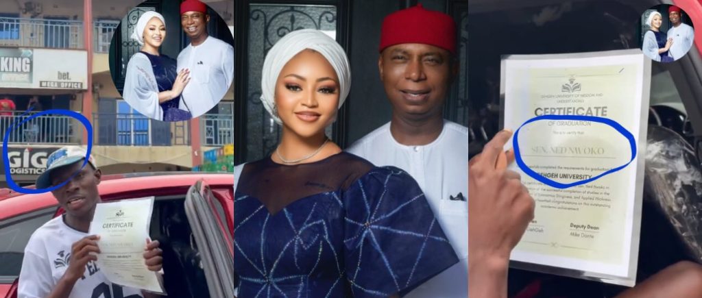 Popular Nigerian comedian GehGeh has gone viral after humorously “awarding” Senator Ned Nwoko a satirical certificate from his fictional GehGeh University of Wisdom and Understanding.