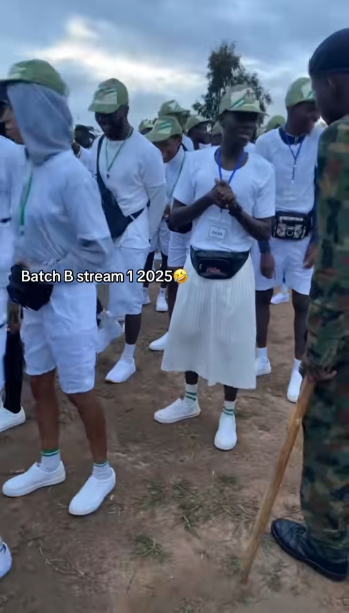 The unidentified corper was seen in a pleated white skirt, a clear deviation from the official camp dress code, which requires corps members to wear white T-shirts, shorts, and sneakers during drills and activities.