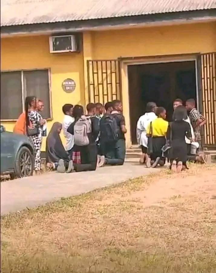 In a surprising turn of events, fresh undergraduate students at the Federal University of Lafia were recently seen on their knees begging a lecturer to allow them back into the classroom. A photo shared on the university’s Facebook group showed the 100-level students pleading for readmission, sparking mixed reactions online.