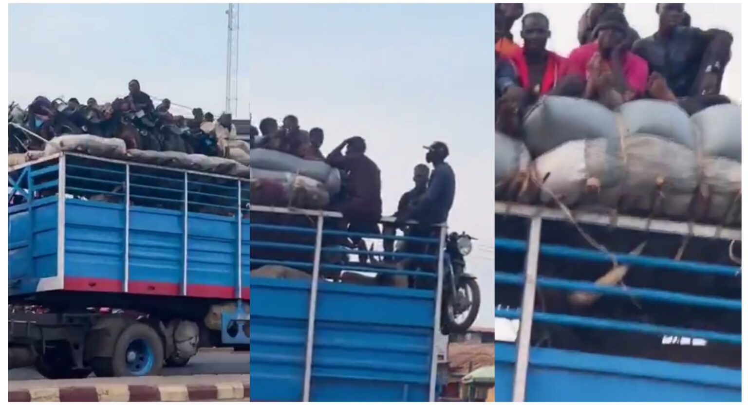 The truck was spotted around the busy Dugbe area, appearing heavily packed with young men sitting closely together, several motorcycles tied to its sides, and cows positioned at the rear.
