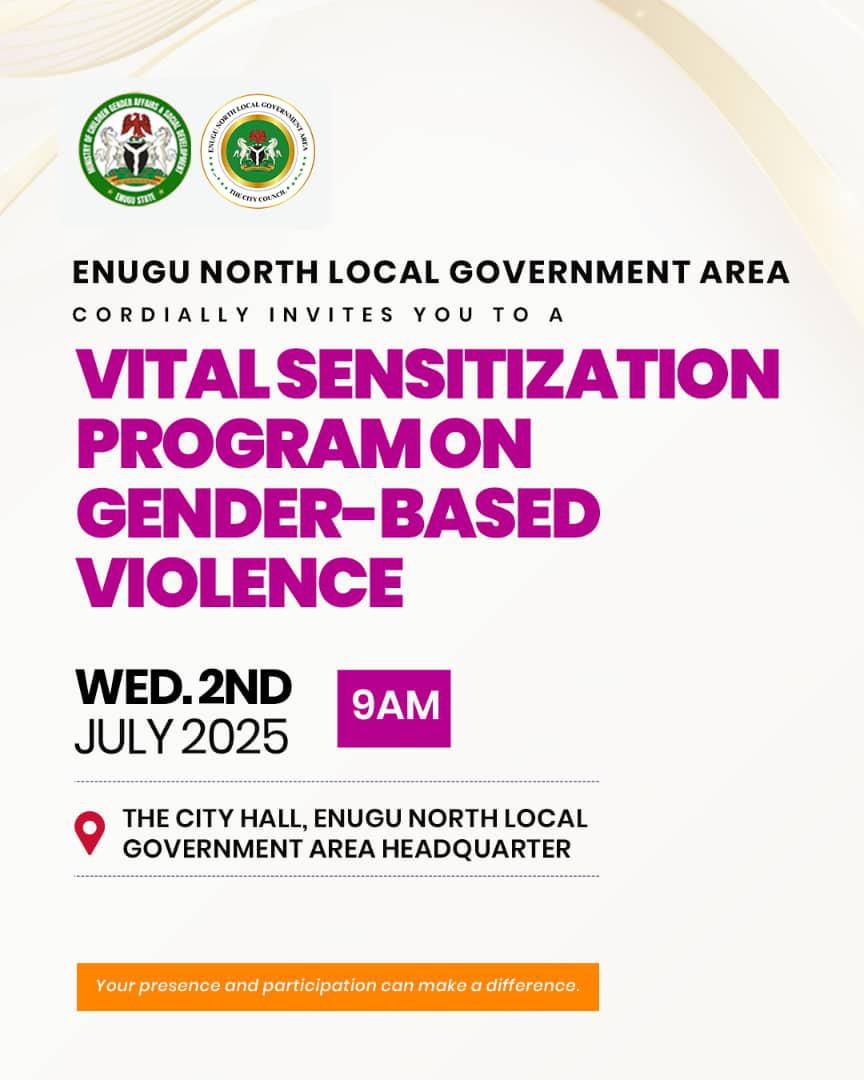 The Enugu North Local Government in Partnership with The Ministry of Gender Affairs will host a Vital Sensitization Program on Gender-Based Violence Tomorrow Wednesday, July 2nd, 2025, by 9AM at the Local Government Headquarters, City Hall. This program is part of the council’s commitment to promoting safer communities and supporting victims and survivors of gender-based abuse.