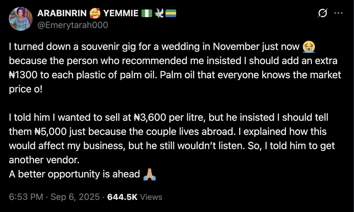 The vendor, identified as Yemmie (X handle: @Emerytarah000), revealed that she was approached to supply palm oil souvenirs for a wedding scheduled in November. However, the intermediary insisted she add ₦1,300 to the price of each unit so he could profit from the difference.
