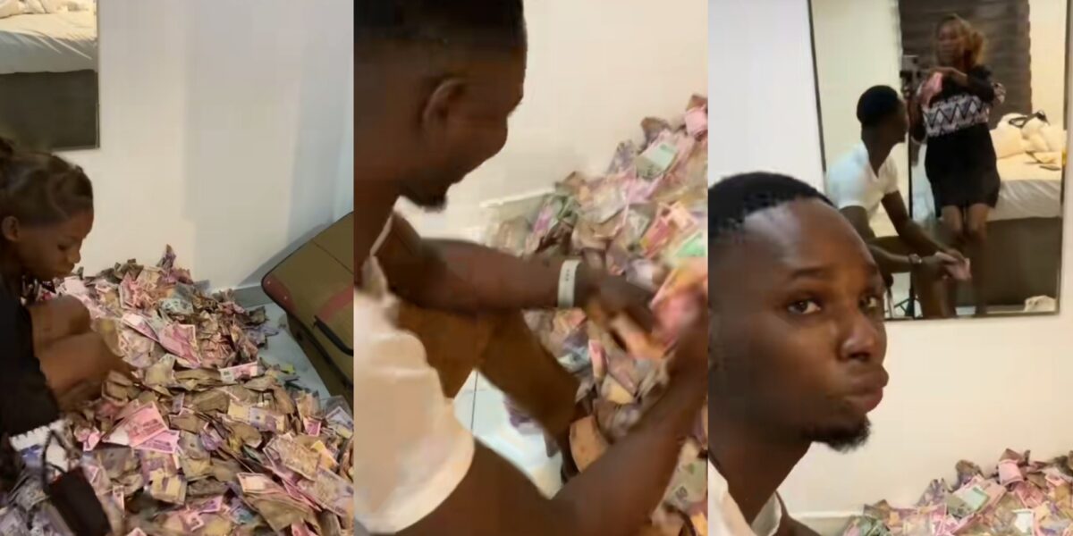 Her husband soon joins in, helping to arrange and count the notes while smiling at the camera. In the background, the hit song “Abule” by Patoranking plays, adding to the celebratory atmosphere.