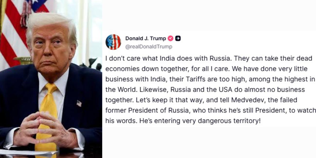 U.S. President Donald Trump has stirred global attention with a fiery message on his Truth Social platform, where he described both the Russian and Indian economies as “dead,” while warning that former Russian President Dmitry Medvedev is entering “very dangerous territory.”